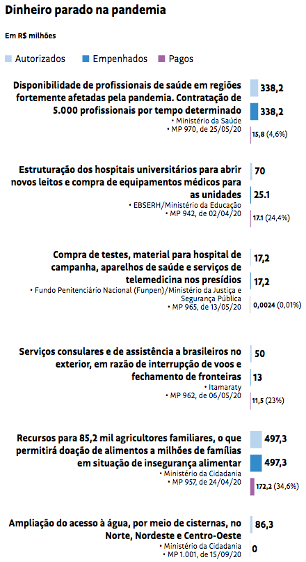 No orçamento de guerra, a pandemia conta com gastos específicos, sem as amarras habituais para a criação de uma despesa. Assim, MPs foram editadas para garantir créditos a diferentes ministérios e órgãos do governo.