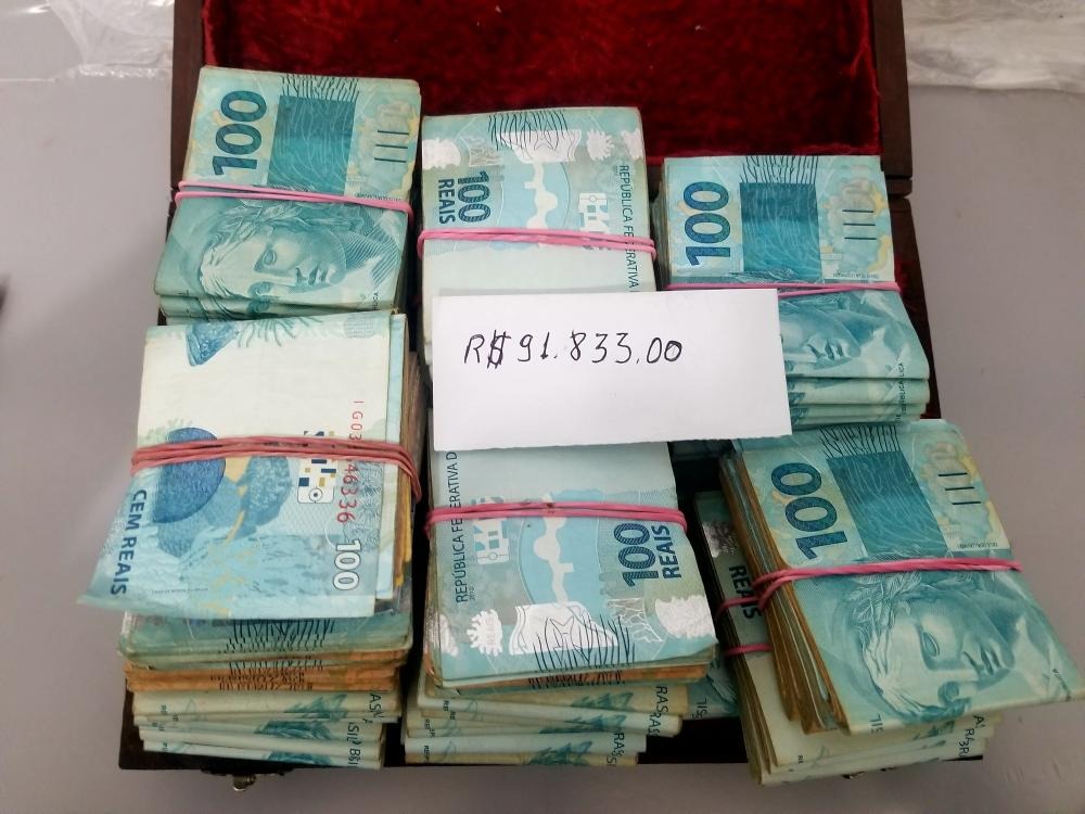 Foram encontrados um revólver calibre 38, uma pistola 380, uma espingarda de pressão, aproximadamente 50 munições de calibres distintos, um lançador de flecha e R$ 91.833 em dinheiro, de acordo com relato da PM.