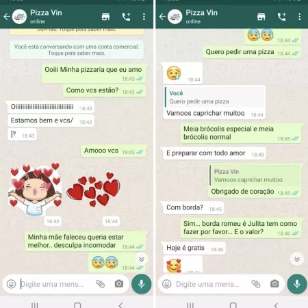 Uma troca de mensagens durante o pedido de uma pizza acalentou o coração do coordenador Adriano Lucio de Oliveira após ele perder a mãe para a Covid-19. O caso aconteceu em Bauru, no interior de São Paulo, e chamou atenção pela empatia e carinho que a atendente teve com o cliente durante o momento de dor do qual passa.