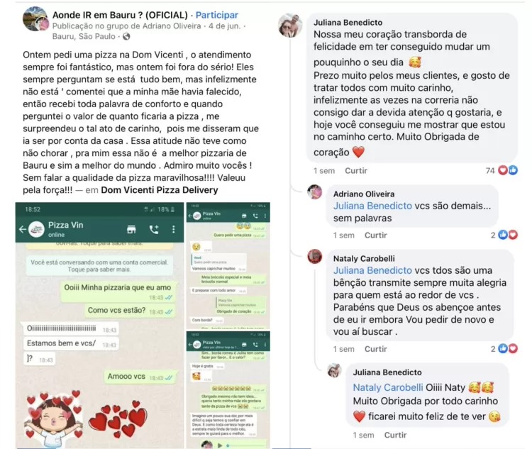 [olho author=””]”Ontem pedi uma pizza na Dom Vicenti, o atendimento sempre foi fantástico, mas ontem foi fora do sério! Eles sempre perguntam se está tudo bem, mas infelizmente não está. Comentei que a minha mãe havia falecido, então recebi toda palavra de conforto e quando perguntei o valor de quanto ficaria a pizza, me surpreendeu o tal ato de carinho, pois me disseram que ia ser por conta da casa”, contou ele em um grupo de Facebook. [/olho]