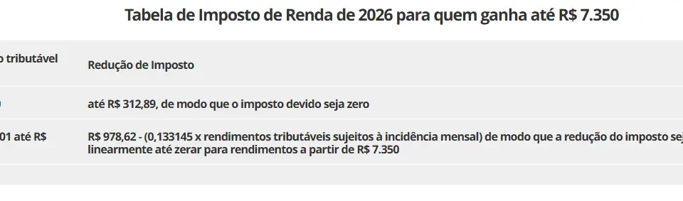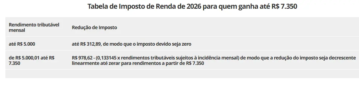 Tabela de Imposto de Renda de 2026 para quem ganha até R$ 7.350