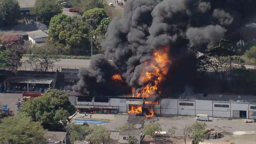 Segundo o Corpo de Bombeiros, As chamas atingem a fábrica que, em princípio, também tem produtos solventes. São três grandes tanques com material inflamável, como thinner, álcool e tolueno.