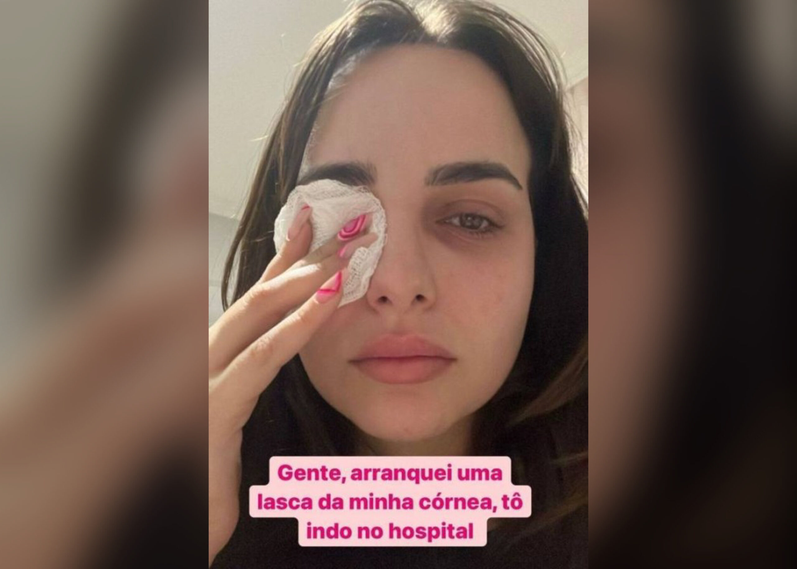 “Eu fiz a unha, que estava afiladinha. Eu, não muito inteligente, fui coçar o olho e, na hora que passei, a minha unha arrancou uma lasca da minha córnea. Foi o que o médico falou”, começou ela, que explicou: “Não saiu pedaço nenhum da córnea na minha unha, então pensei que só tinha arranhado. Mas, segundo o médico, arrancou mesmo”.