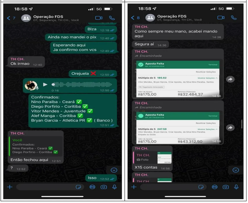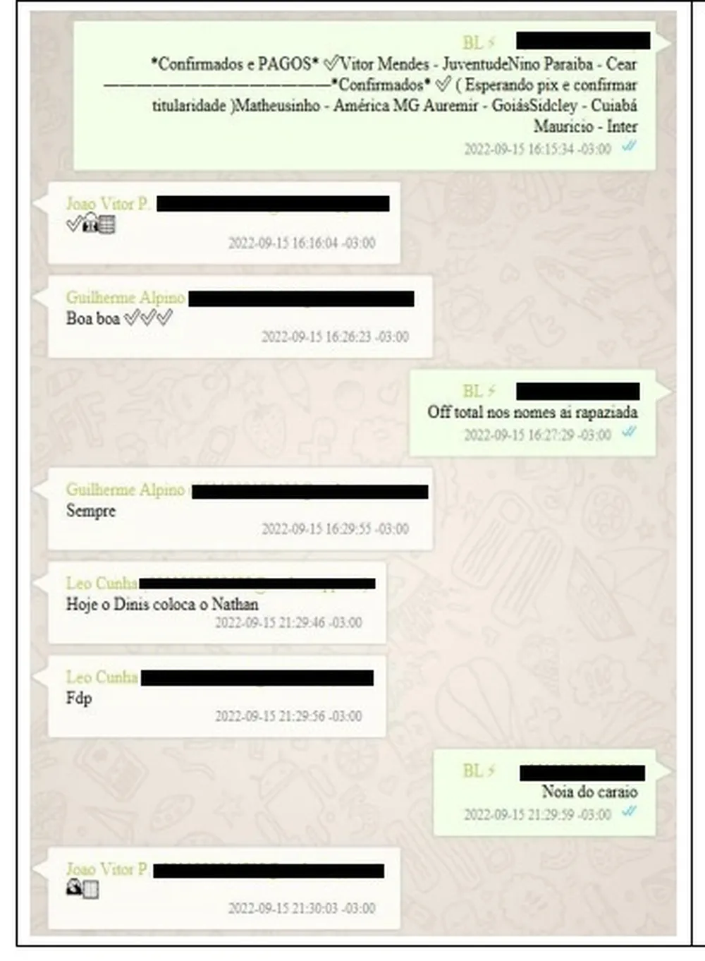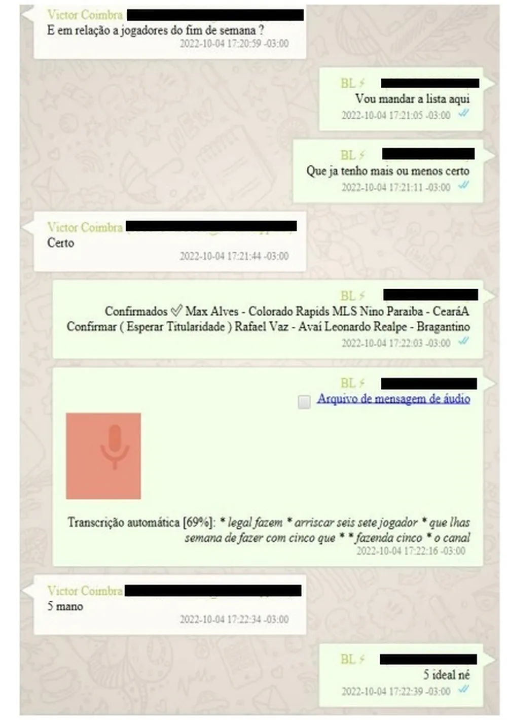 A reportagem teve acesso aos registros da investigação. Nelas, os investigados conversam sobre “nomes certos”, pagamentos, ventilam os nomes de outros atletas e pedem sigilo. Bruno Lopez de Moura, apontado como o chefe do esquema pelo MP-GO, aparece como “BL”. Já Thiago Chambó, apontado como um dos principais financiadores do grupo, é identificado como TH CH.