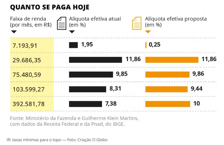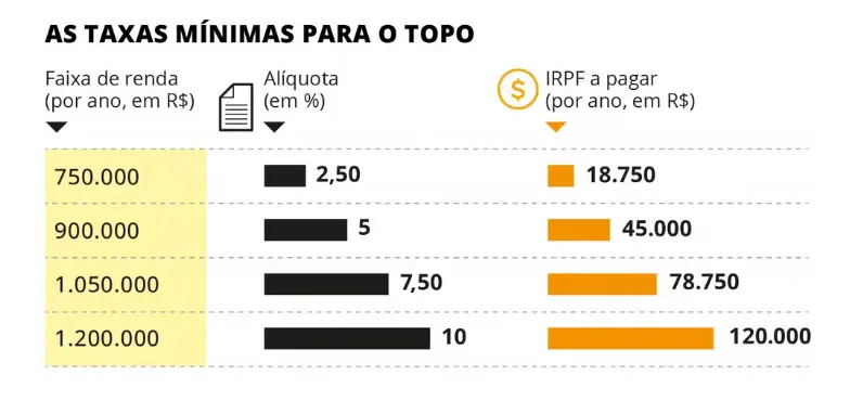 • O projeto também cria um imposto de renda mínimo, que será de 10% para rendas anuais acima de R$ 1,2 milhão — entre R$ 600 por ano e R$ 1,2 milhão, haverá uma escadinha na alíquota até chegar a 10%.