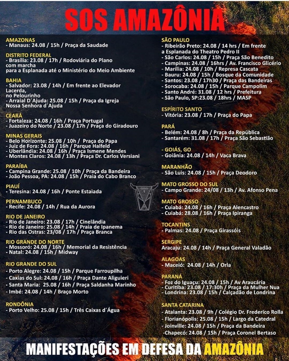 Neste final de semana estão previstas manifestações em diversas cidades brasileiras em defesa da Amazônia. Em Goiânia o ato está previsto para sábado, a partir das 14 horas no Parque Vaca Brava, no setor Bueno. De lá, os manifestantes seguem para a Praça Cívica, no Centro.