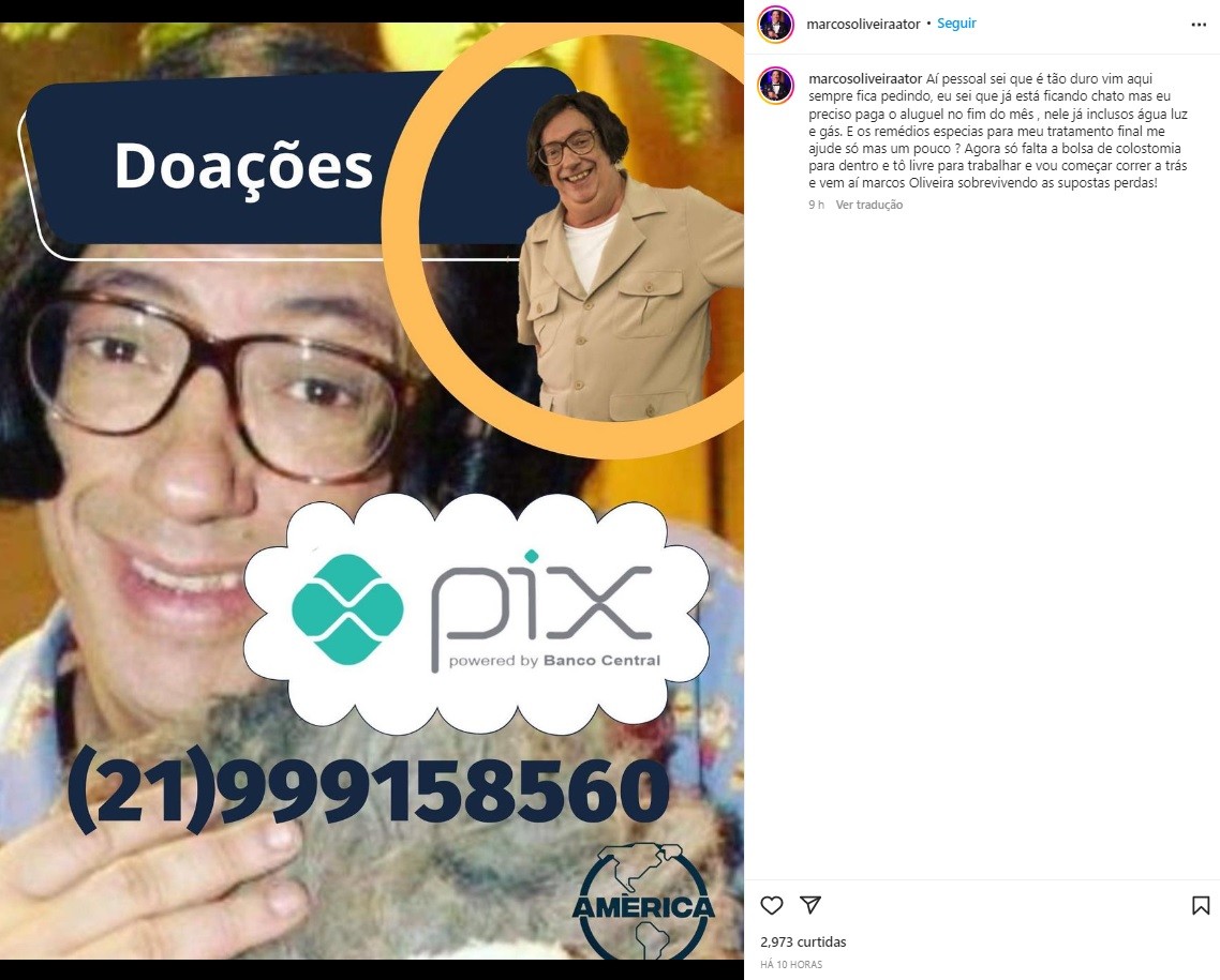 Por fim, o ator afirmou que depois disso começará a correr atrás novamente de trabalho. “Vem aí, Marcos Oliveira sobrevivendo às supostas perdas”, encerrou ele, deixando a chave pix para doações.