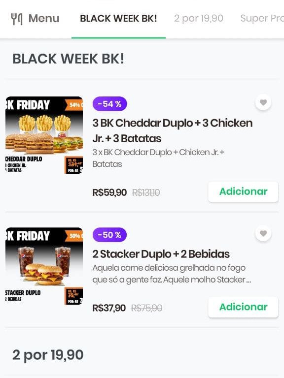 O Burger King está promovendo descontos de até 50% no valor dos lanches. Por meio de cupons, disponibilizados no aplicativo da rede, o usuário pode encontrar ofertas durante o período da black friday e também quando a data passar.