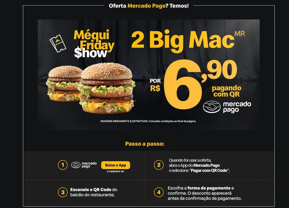 Apesar das grandes ofertas chamarem atenção, os estabelecimentos alertam que os descontos dependem da localização e disponibilidade de entrega da região. Em parceria com o Mercado Pago, o Mc Donald’s inovou neste ano. Até o fim desta sexta-feira (27), os consumidores podem reservar um cupom, que poderá ser usado do dia 1 a 15 de dezembro, que garante dois sanduíches por R$2,99 nos restaurantes participantes, em compras a partir de R$13,00.