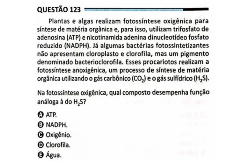Em relação às questões quase idênticas, um dos exemplos é um item sobre fotossíntese. Na versão divulgada por Teixeira, a questão é mais extensa do que a versão presente no Enem 2025 (questão de 123, do caderno azul). Veja a seguir: