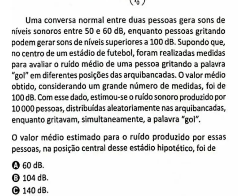 Uma conversa normal entre duas pessoas gera sons de níveis sonoros entre 50 e 60 dB, enquanto pessoas gritando podem gerar sons de níveis superiores a 100 dB. Supondo que, no centro de um estádio de futebol, foram realizadas medidas para avaliar o ruído médio de uma pessoa gritando a palavra “gol” em diferentes posições das arquibancadas. O valor médio obtido, considerando um grande número de medidas, foi de 100 dB. Com esse dado, estimou-se o ruído sonoro produzido por 10.000 pessoas, distribuídas aleatoriamente nas arquibancadas, enquanto gritavam, simultaneamente, a palavra “gol”.