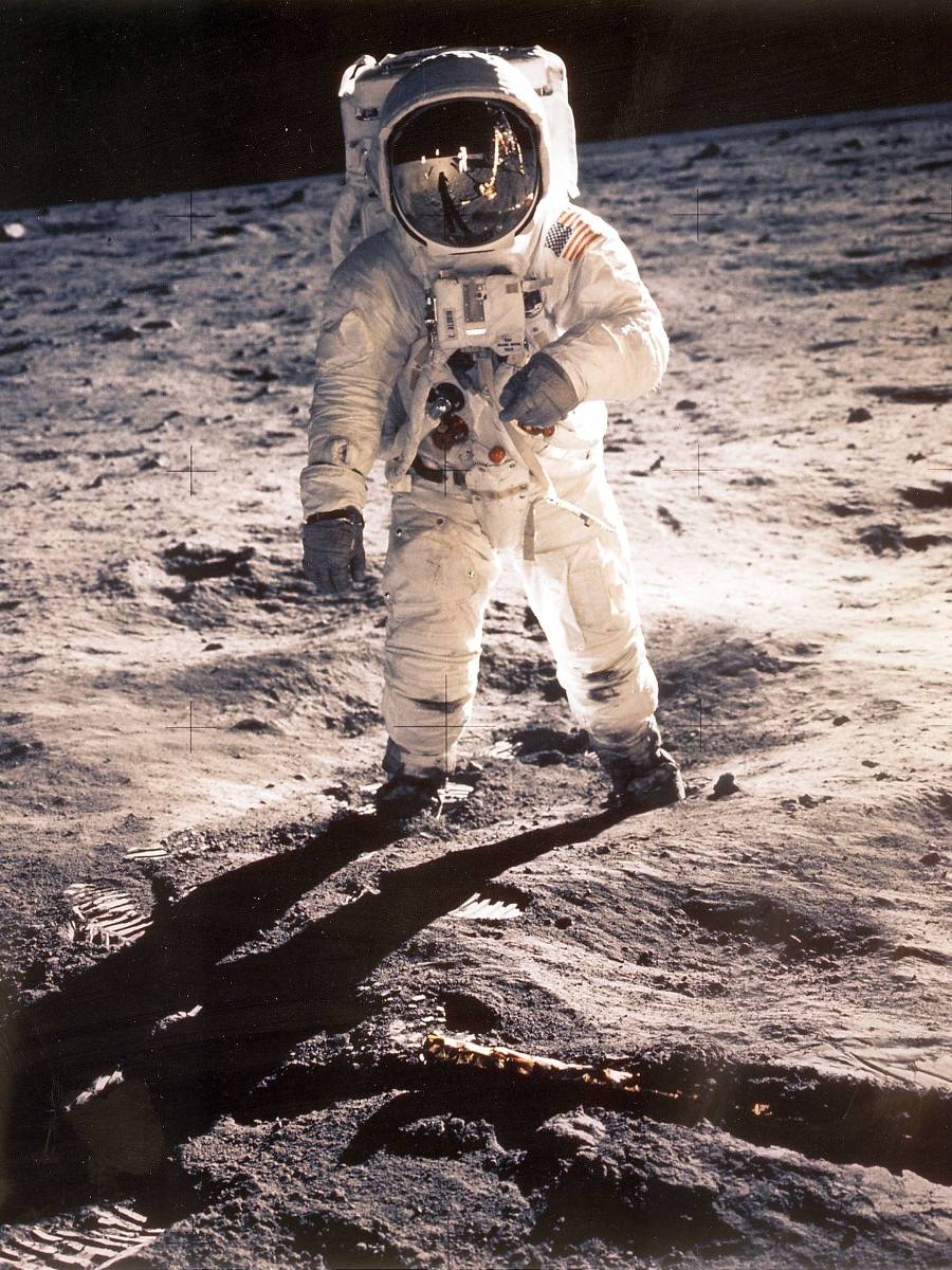 Com tudo pronto, trajes devidamente vestidos e cabine despressurizada, Neil Armstrong abriu a escotilha do Eagle às 23h39 e foi cuidadosamente descendo degrau por degrau da escada que levava à superfície. Às 23h56 (de Brasília), colocou sua bota esquerda sobre o solo lunar. “Um pequeno passo para um homem, um salto gigantesco para a humanidade.”