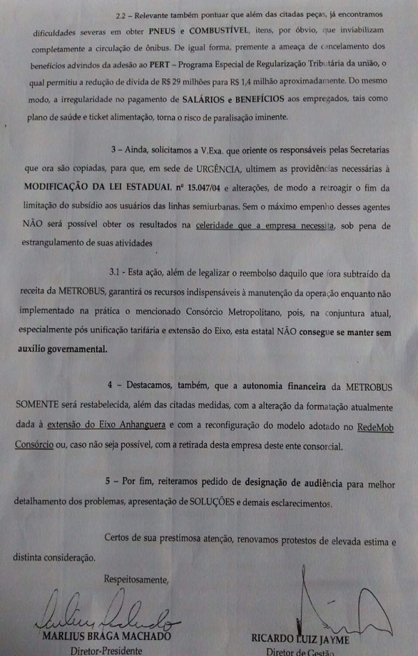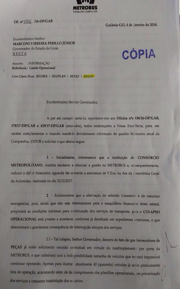 Um documento obtido com exclusividade pelo Mais Goiás aponta justificativas do presidente da empresa. O ofício, direcionado ao governador, aponta os problemas financeiros e pede uma audiência para apontar as “soluções”. Para resolver as questões financeiras — que vão desde falta de recursos para pagamento de pessoal, falta de verba para aquisição de peças e pneus para os ônibus articulados, a falta de combustível — a solução seria integrar a um grupo de outras empresas que somarão esforços para que consigam manter o trabalho ativo nas linhas que compõem o Eixo Anhanguera.