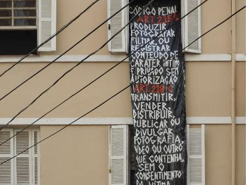 “Um lado meu pensa que não podem me invadir assim e minha intenção é de continuar com a rotina normalmente. Por outro lado, na prática, as imagens me desestruturaram muito e não consigo deixar de pensar na possibilidade de que alguém está me observando. Por isso decidi produzir uma faixa, com a ajuda de artistas plásticos, a fim de alertar os envolvidos sobre os crimes que cometeram.” Enquanto a investigação segue, a faixa está pendurada na sua janela.