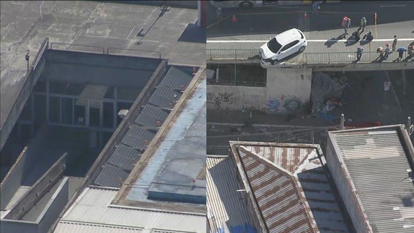 O carro bateu na grade de proteção do viaduto, rompeu-a e só parou com a roda esquerda dianteira já no ar.