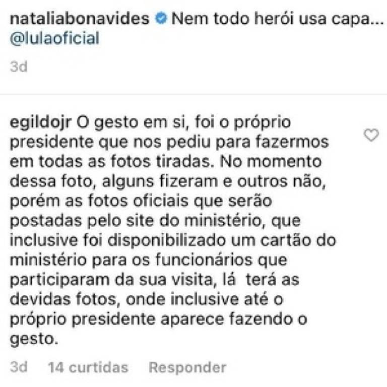 Também na quinta-feira (24) Egildo comentou a postagem da deputada Natália Bonavides no Instagram: “No momento dessa foto [publicada pelo MDR], alguns fizeram [o gesto de apontar para o céu] e outros, não”.