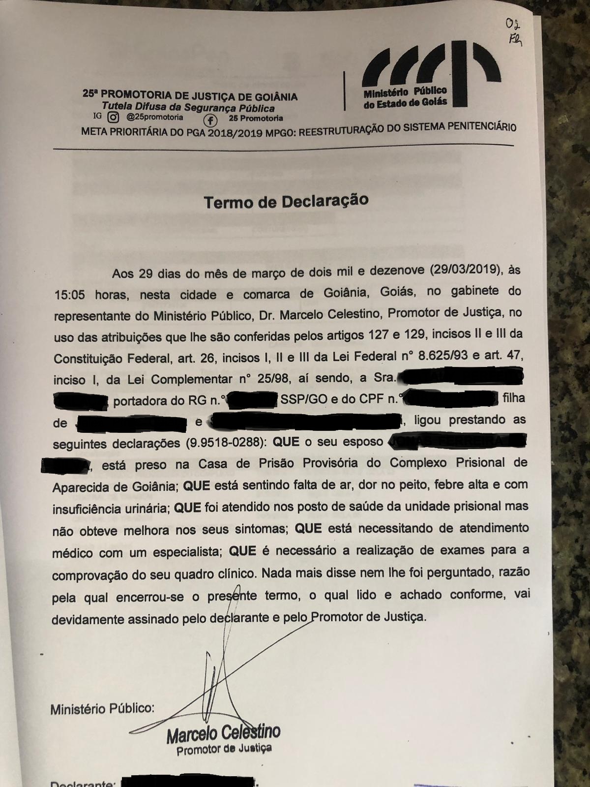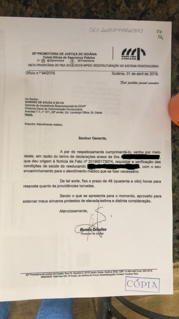 Apesar da solicitação, o detento não foi liberado. Segundo relatos da mulher, o promotor Marcelo Celestino fixou o prazo de 48h para respostas tanto sobre o estado de saúde do preso, quanto para encaminhamento para atendimento médico especializado. Novamente, conforme Marta, o pedido não foi atendido.
