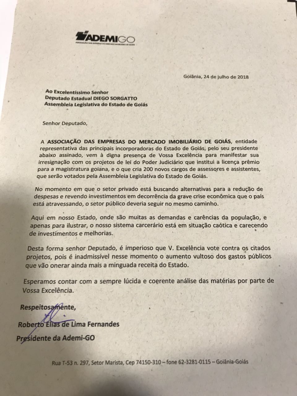 Outros órgãos e associações também se posicionaram contrários ao projeto que estabelece a licença-prêmio. Dentre eles, a Associação das Empresas do Mercado Imobiliário de Goiás (Ademi-GO) que divulgou um documento enviado ao deputado estadual Diego Sorgatto (PSDB) se posicionando contra a medida.