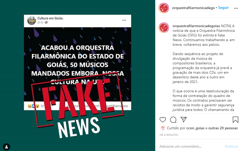 A notícia de que a Orquestra Filarmônica de Goiás (OFG) foi extinta é Fake News. Continuamos trabalhando e, em breve, voltaremos aos palcos.