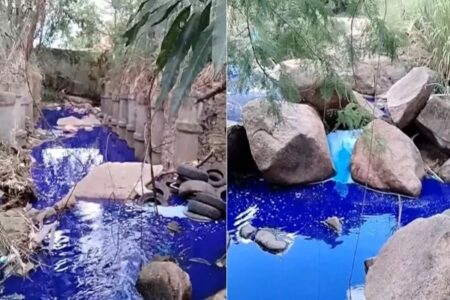 POLUIÇÃO Água de córrego fica azul após descarte irregular de tinta em SP O descarte irregular de tintas deixou a cor do córrego Santa Cruz, no bairro Marília, totalmente azul há 1 ano