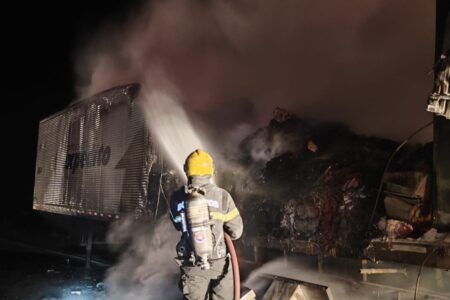ACIDENTE Caminhão baú carregado pega fogo na GO-080, em Goiânia O caminhão estava carregado com remédios, material para construção, vasos sanitários, gêneros alimentícios, cestas básicas e vestimentas há 2 anos