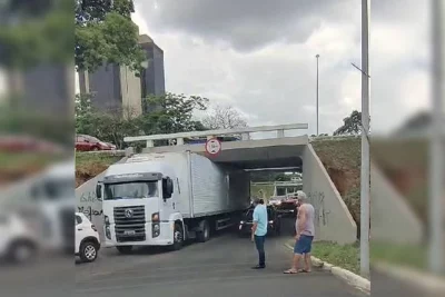 Trânsito Motorista ignora sinalização e caminhão entala em viaduto no DF No local, há placas que dizem que só veículos com até 3,70 metros conseguem passar, mas o motorista as ignorou há 2 anos