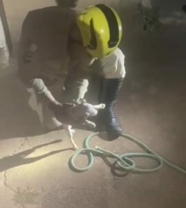 Bombeiros Cadelinha presa em bueiro é é resgatada no Jardim Ingá, em Luziânia Animal foi salvo por equipe de resgate e agora aguarda adoção permanente há 2 anos