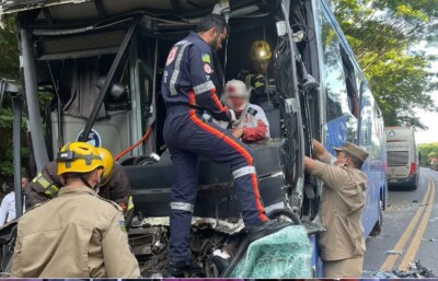 TRÂNSITO Ônibus interestadual bate em carreta e motorista fica ferido, na BR-020 Ele ficou presos às ferragens e precisou de resgate do Corpo de Bombeiros, na BR-020, no município de Posse, no nordeste de Goiás há 2 anos
