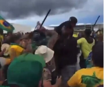#invasãodocongresso Vídeo: Manifestantes golpistas derrubam PM de cavalo em Brasília Em uma transmissão feita nas redes sociais é possível ver um grupo agredindo o PM com pedaços de madeira e atirando objetos até ele cair há 2 anos