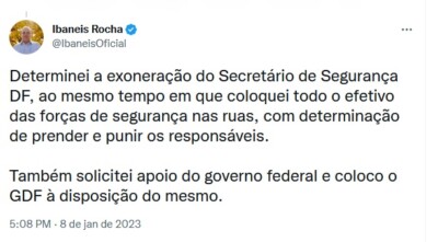 Exonerado Ibaneis determina a exoneração de Anderson Torres, secretário de Segurança do DF A exoneração do ex-ministro da Justiça de Jair Bolsonaro (PL) ocorre após manifestantes extremistas que apoiam o ex-presidente invadirem a sede dos Três Poderes há 2 anos