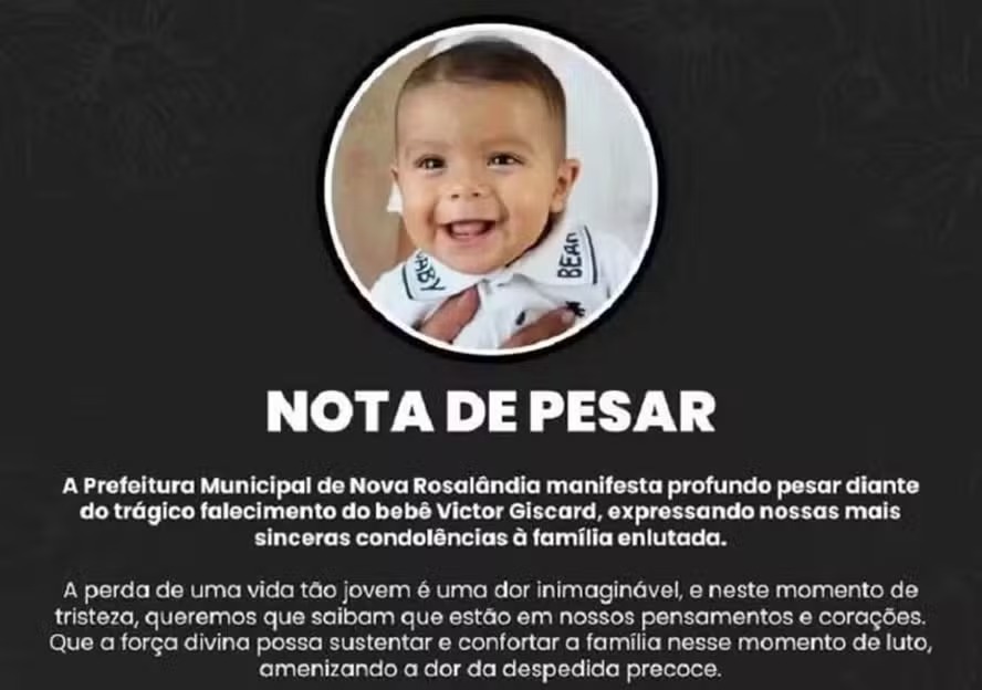 A Prefeitura de Nova Rosalândia emitiu uma nota em que lamenta a morte do bebê e expressa condolências à família da criança.