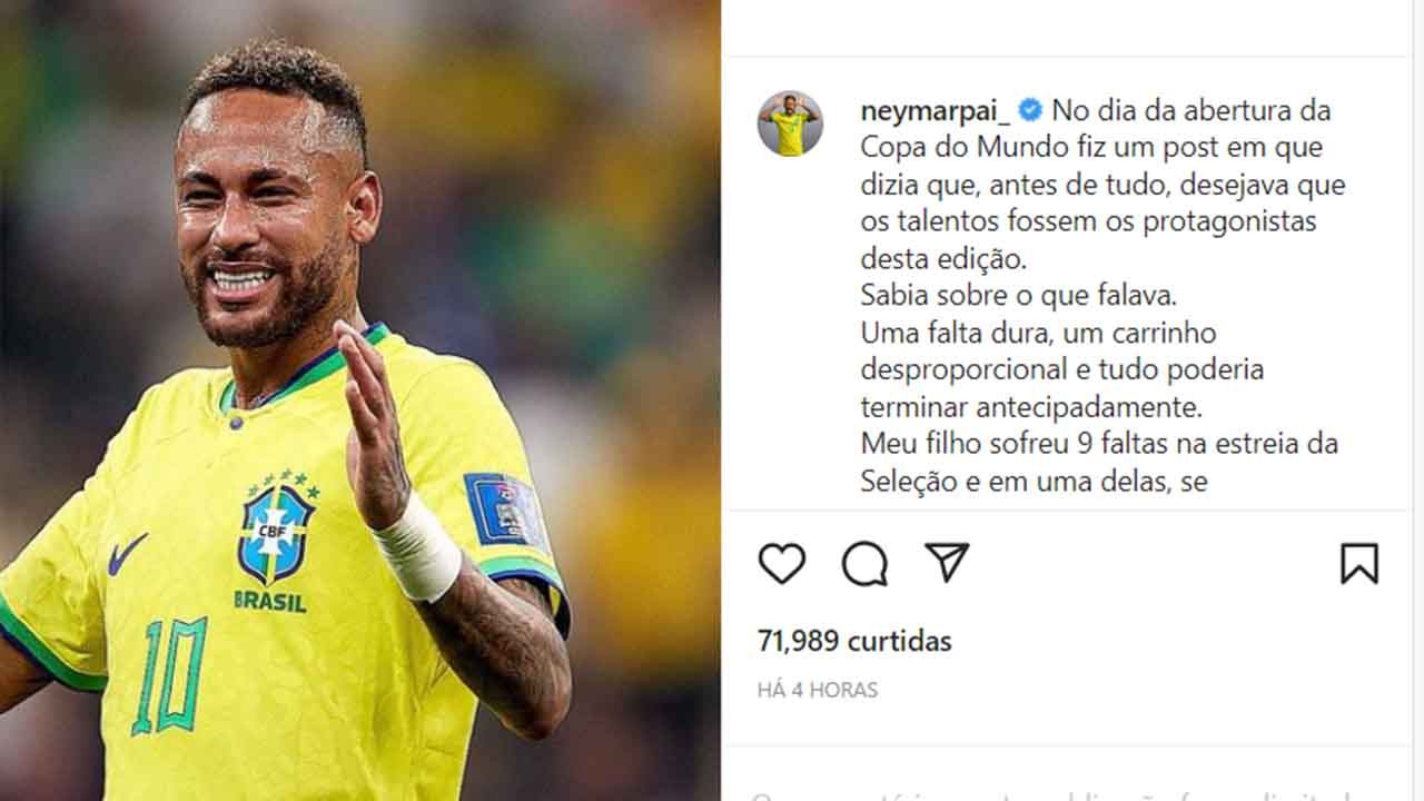 “No dia da abertura da Copa do Mundo fiz um post em que dizia que, antes de tudo, desejava que os talentos fossem os protagonistas desta edição. Sabia sobre o que falava. Uma falta dura, um carrinho desproporcional e tudo poderia terminar antecipadamente. Meu filho sofreu 9 faltas na estreia da Seleção e em uma delas, se machucou. Não quero e não vou discutir sobre isso, deixo para vocês analisarem”, escreveu Neymar Pai.