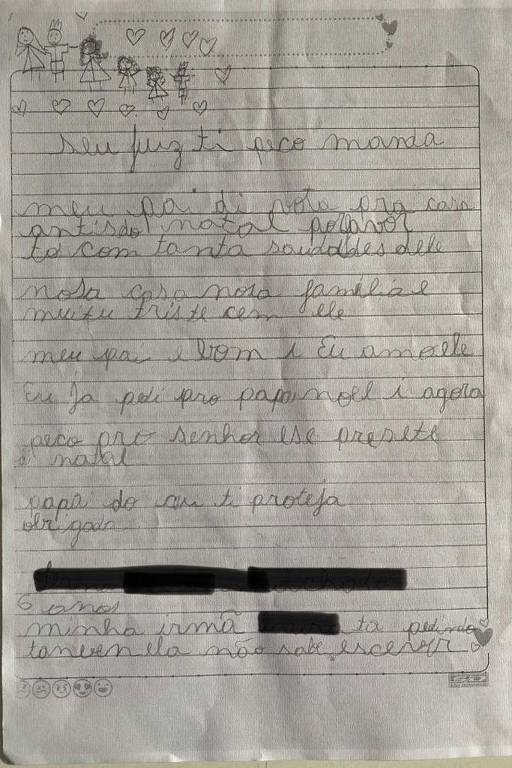O advogado Leonardo Magalhães Valente, que defende o acusado, entregou as cartas ao juiz. Em uma delas, a filha mais nova relatou que a casa e a família estavam muito tristes sem o pai. “Meu pai é bom”, escreveu a criança, pedindo que o genitor fosse liberado para voltar para casa antes do Natal.