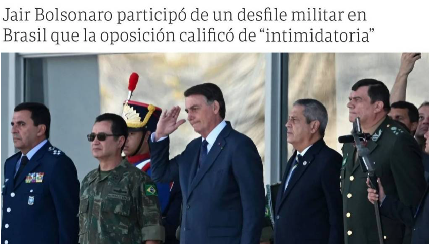 Para o Clarín (abaixo), com foto de Bolsonaro ladeado pelo general Braga Netto e comandantes militares, “Episódio ocorre em clima de tensão devido aos repetidos ataques do presidente ao sistema eleitoral”.