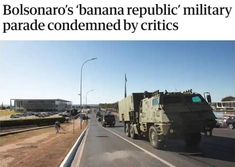 Na descrição do Guardian (acima), logo abaixo do título que trata o país como república bananeira, “Tanques rodam pelas ruas de Brasília conforme Congresso se prepara para votar planos [de Jair Bolsonaro] para mudar o sistema de votação no Brasil”.
