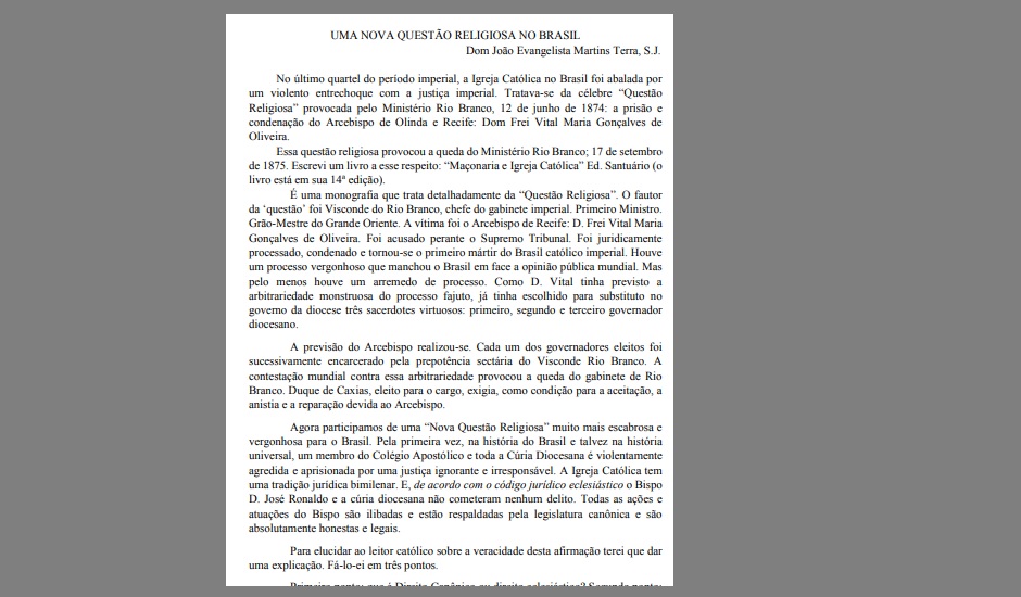 No texto, Dom Terra reitera transcorre o misto opinativo e argumentativo, com base nas escrituras religiosas e com base no Direito Canônico.