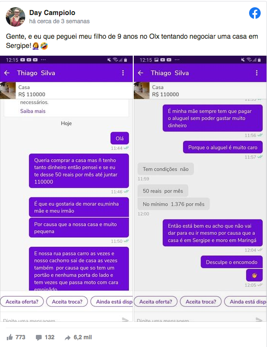 O vendedor no anúncio nega a oferta de pagamento. O garoto mostra compreensivo e depois se desculpa pelo incômodo. “Está bem. Acho que não vai dar mesmo para eu ir, porque a casa é em Sergipe e eu moro em Maringá”.