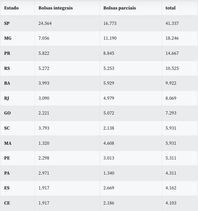 As inscrições começam na terça-feira (12) e se encerram na sexta (15). De acordo com o MEC, os estados com o maior número de bolsas ofertadas são: São Paulo, Minas Gerais, Paraná e Rio Grande do Sul. Em Goiás são ofertadas 7.293 bolsas no total, sendo 5.072 parciais e 2.221 integrais.