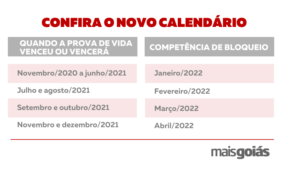 O INSS também estabeleceu um novo calendário com vencimentos da prova de vida a partir de janeiro de 2022 para beneficiários que estão há mais tempo sem fazer a atualização cadastral. Segundo a portaria, os beneficiários com vencimento da última comprovação de vida entre novembro de 2020 e dezembro de 2021 deverão realizá-la de forma escalonada. Na prática, os vencimentos que ocorreriam de outubro a dezembro deste ano passam a vencer em janeiro de 2022. Veja o calendário abaixo.