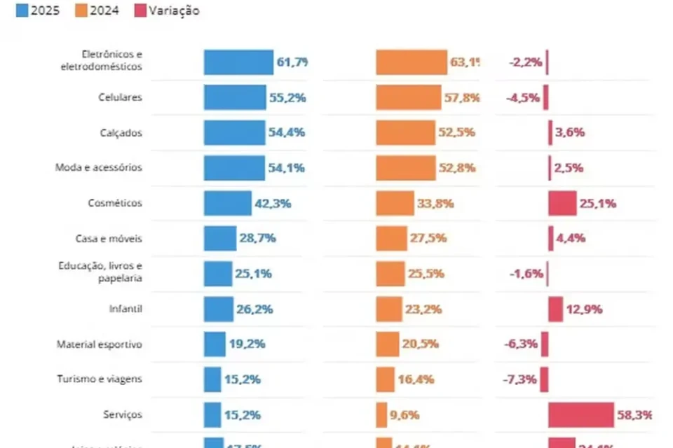 Entre as categorias que mais devem impulsionar esse crescimento está a de cosméticos, que registrou alta de 25,1% em relação a 2024 e agora ocupa a quinta posição, com 42,3% das intenções de compra no ranking de 2025 da Conversion.