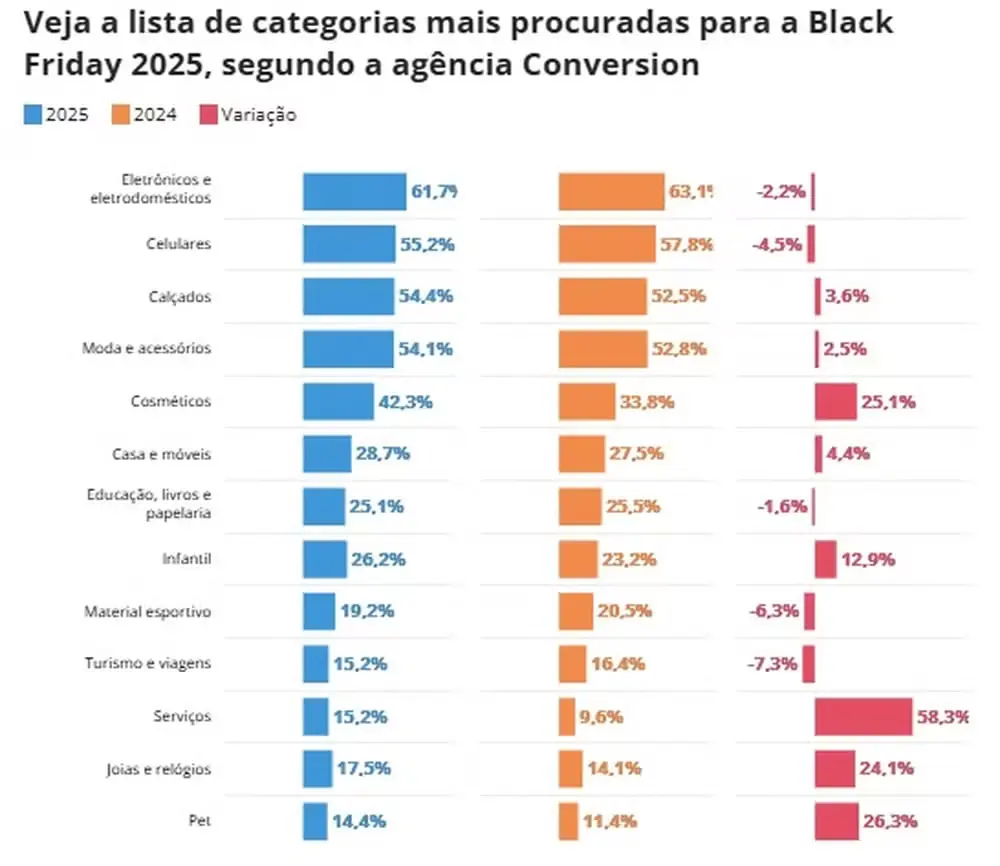 Embora ainda liderem a lista de desejos, com 61,7% das intenções de compra na Black Friday 2025, eletrônicos e eletrodomésticos registraram uma leve retração de 2,2 pontos percentuais na preferência do consumidor em relação ao ano anterior (de 63,1% para 61,7%), segundo o levantamento da Conversion.