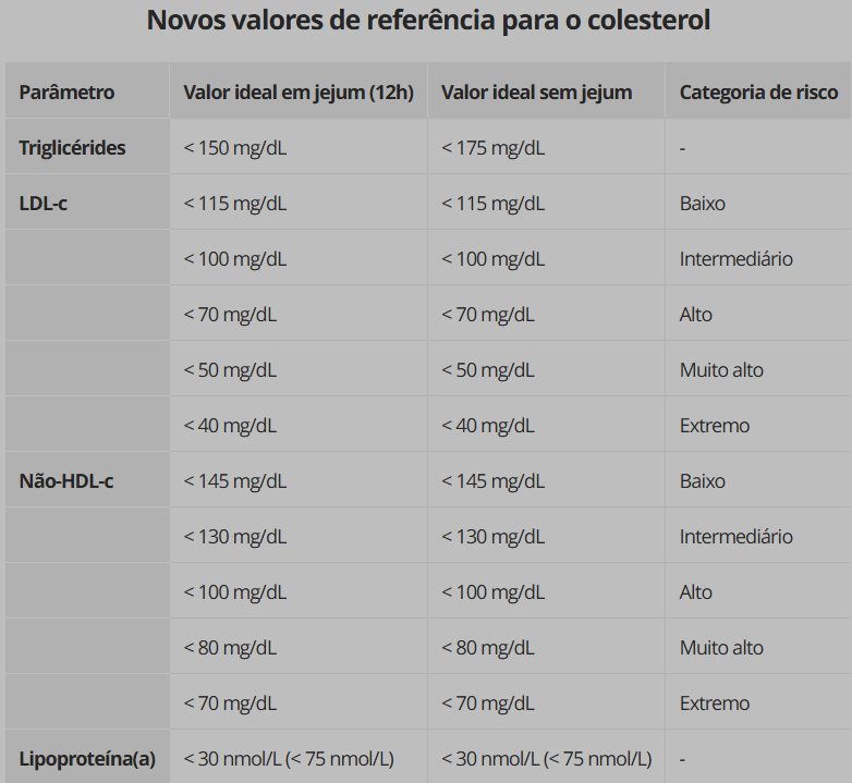 O colesterol LDL, conhecido como “colesterol ruim”, teve mudanças na faixa considerada ideal para pessoas de baixo risco cardiovascular. Agora, o limite passa a ser de até 115 mg/dL, contra 130 mg/dL estabelecidos em 2017.