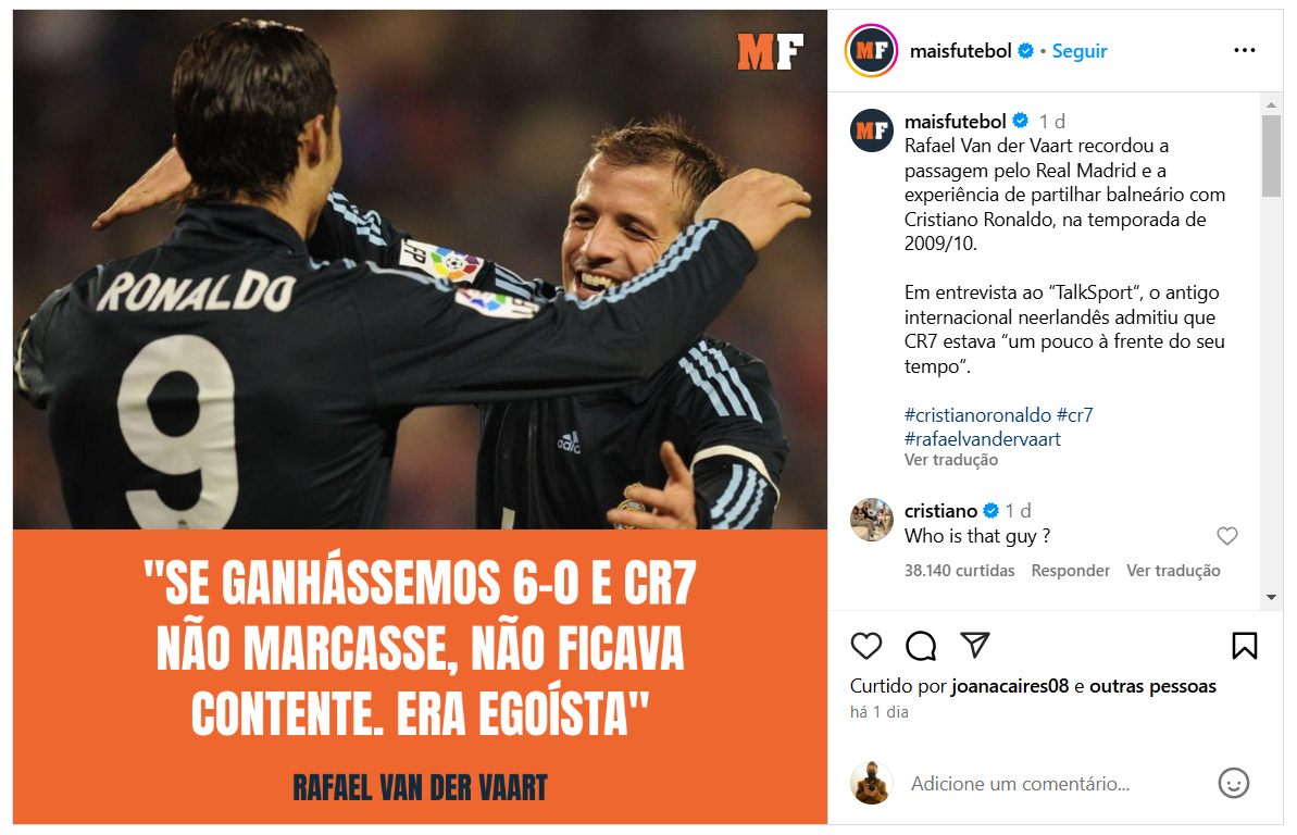 O perfil do Instagram @maisfutebol (veja aqui o post), postou as falas do holandês e foi surpreendida com a presença de CR7 nos comentários. “Quem é esse cara?”, comentou o astro português. Seu comentário de Cristiano Ronaldo já tem mais de 38 mil curtidas.