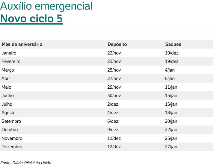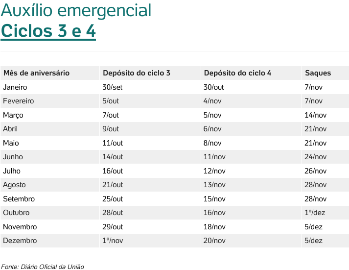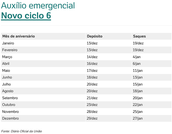 Serão seis ciclos no total. A cada um deles, todos os beneficiários recebem uma nova parcela (seja de R$ 600 ou de R$ 300), conforme o mês de aniversário.