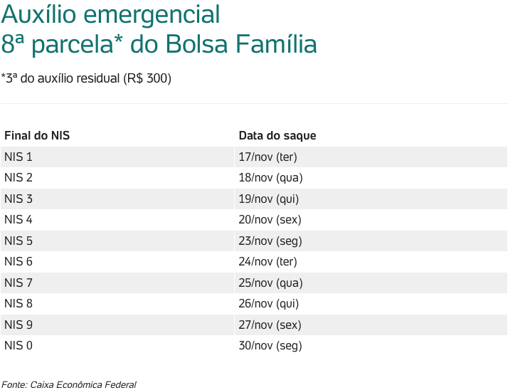 Até 30 de novembro, a terceira parcela do auxílio extensão (de R$ 300) será liberada para todos do Bolsa Família que tem direito, começando pelo NIS 1 e terminando pelo NIS 0.