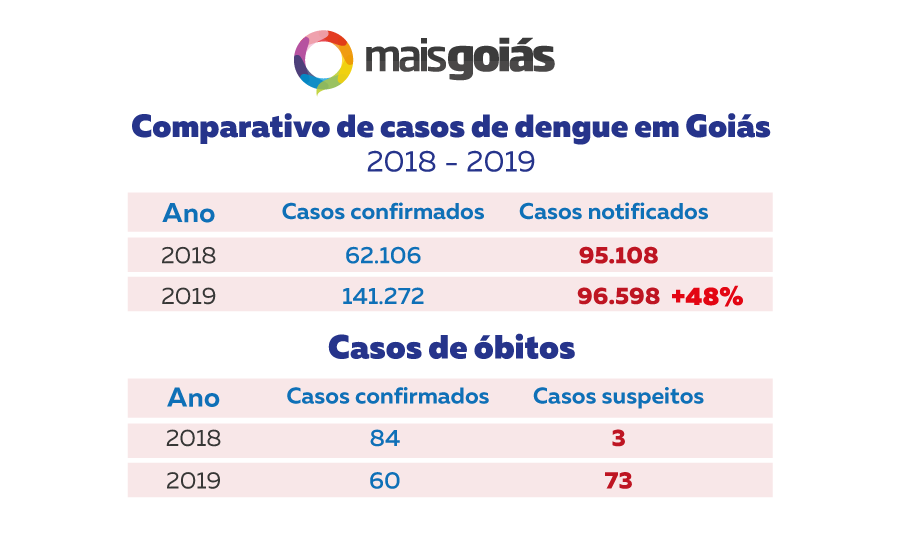 Até 26 de outubro de 2019, foram notificados em Goiás 141.272 mil casos, dos quais 96.598 foram confirmados. Em comparação com o ano anterior, houve aumento de 48,54%. No mesmo período em 2018, foram 95.108 mil notificações e 62.106 confirmações.