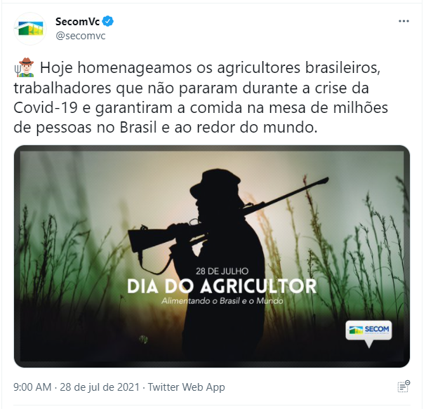 O Sindicato Nacional dos Peritos Federais Agrários (SindPFA) se manifestou contra a postagem publicada pela comunicação da presidência da República em homenagem ao Dia do Agricultor. A foto mostrava a silhueta de homem carregando uma arma. “Isso, definitivamente, não é o que define um agricultor”, escreveu o SindPFA.