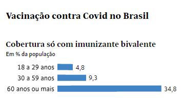 Dados de todo o Brasil atestam que a procura realmente está baixa. Desde 24 de abril, o Ministério da Saúde liberou a vacina bivalente para todos aqueles com mais de 18 anos e deixou que cada governo local decidisse a disponibilidade da dose. Até agora, somente 13% do público elegível no Brasil se preocupou em tomar a nova dose, com cobertura especialmente baixa entre os mais jovens.