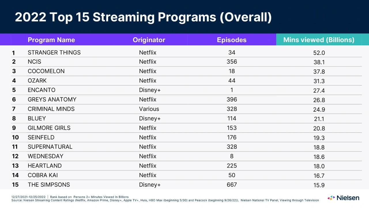 Observe que a Nielsen usa a metodologia de reconhecimento de conteúdo baseada em áudio para rastrear um subconjunto de residências com TV – o que exclui dispositivos móveis e PCs. Com base nesses dados, a Nielsen extrapola o total estimado de visualizações de streaming nos EUA para plataformas como Netflix, Hulu, Disney+, Prime Video da Amazon, HBO Max e Apple TV+.