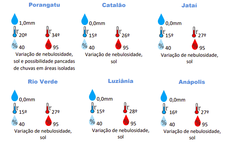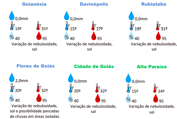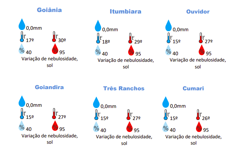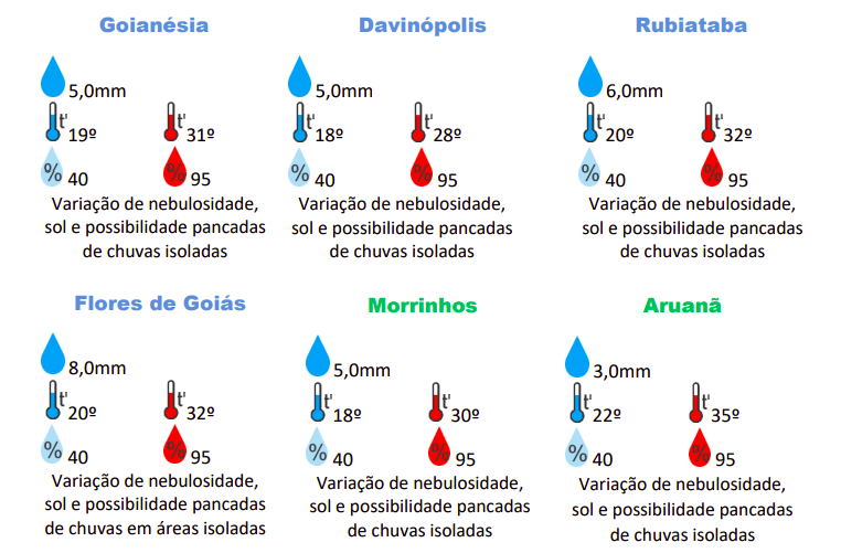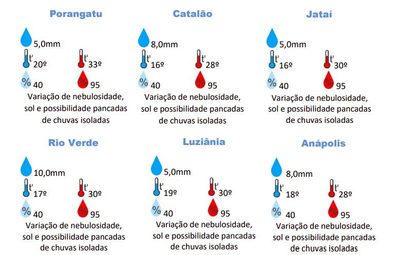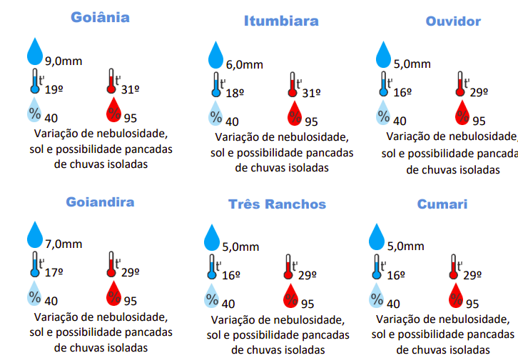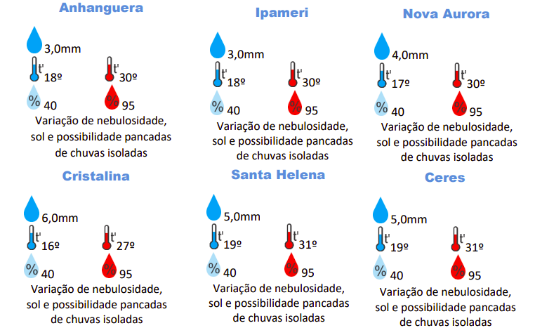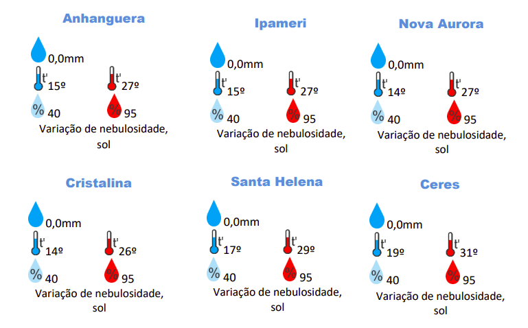 Prognósticos indicam que, no sábado (5), os municípios com menor temperatura prevista são os de Cristalina e Nova Aurora. Ambos poderão registrar 15°C, com máximas de 26°C e 27°C.